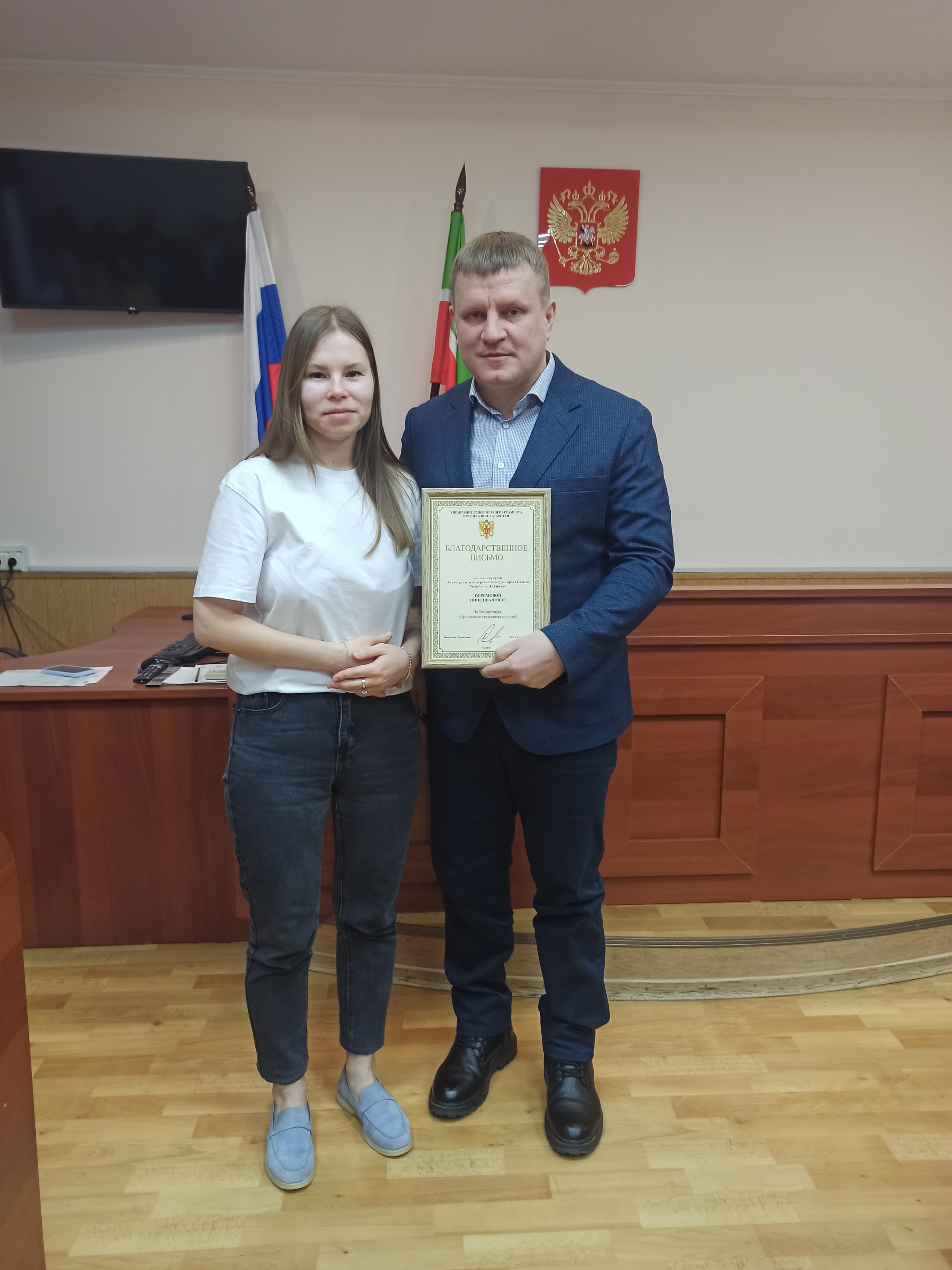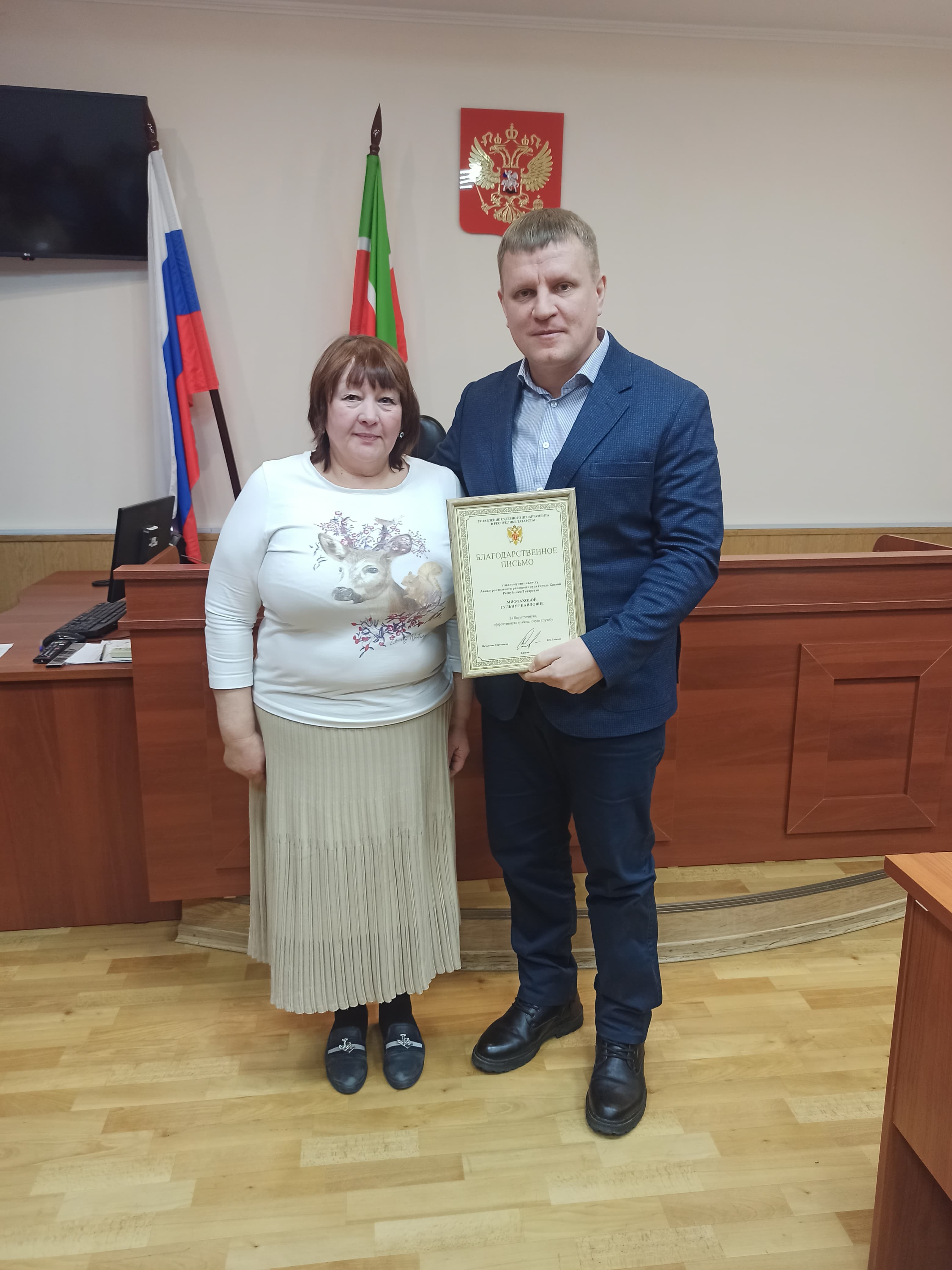Помощнику судьи Нине Ефремовой и главному специалисту Гульнур Наиловне Мифтаховой вручены благодарственные письма Управления Судебного департамента в Республике Татарстан.