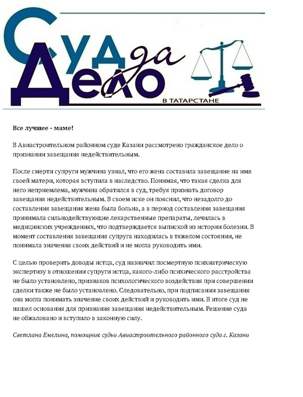 В новом выпуске газеты "Суд да дело в Татарстане" опубликована статья помощника судьи Светланы Емелиной "Все лучшее - маме!" ![]() |