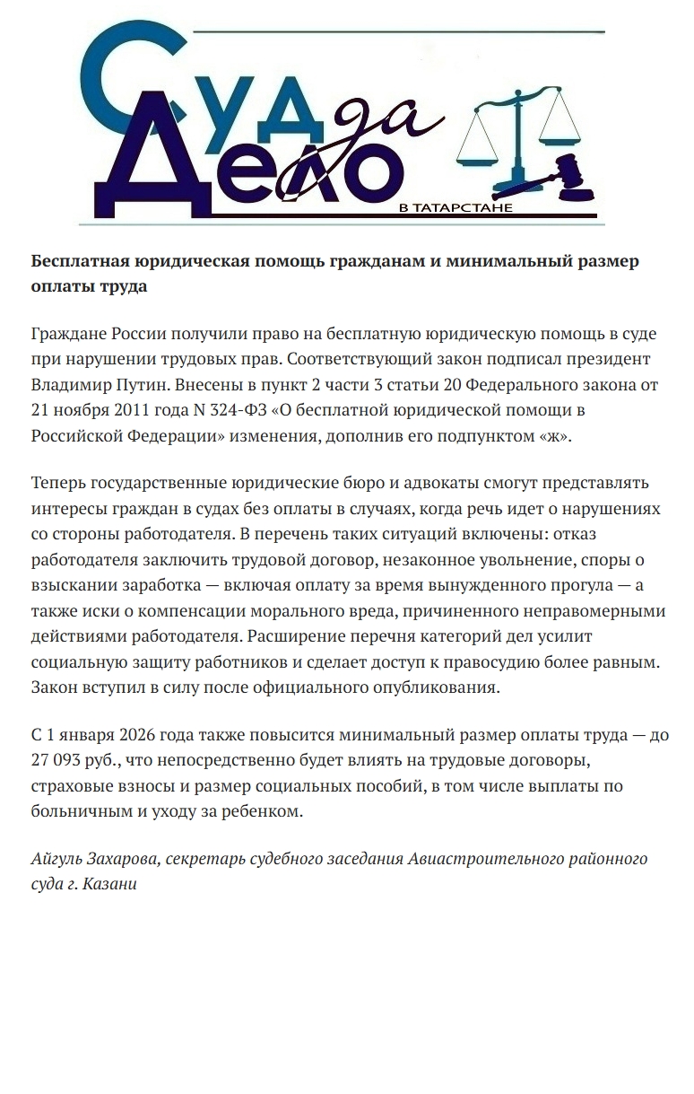 В новом выпуске газеты "Суд да дело в Татарстане" опубликована статья секретаря судебного заседания А.Захаровой "Бесплатная юридическая помощь гражданам и минимальный размер оплаты труда"![]() |