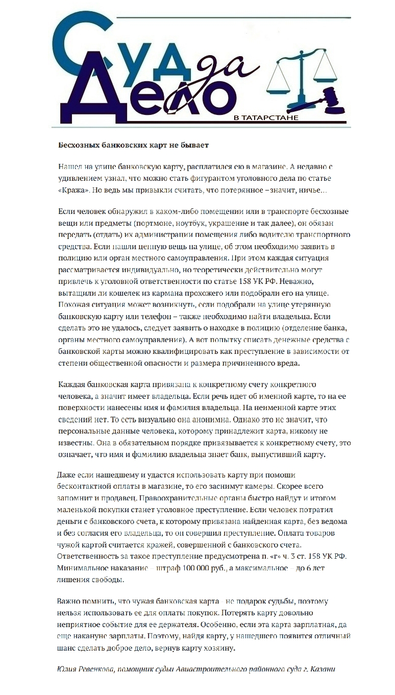 В газете "Суд да дело в Татарстане" опубликована статья помощника судьи Ю.Ревенковой "Бесхозных банковских карт не бывает" ![]() |