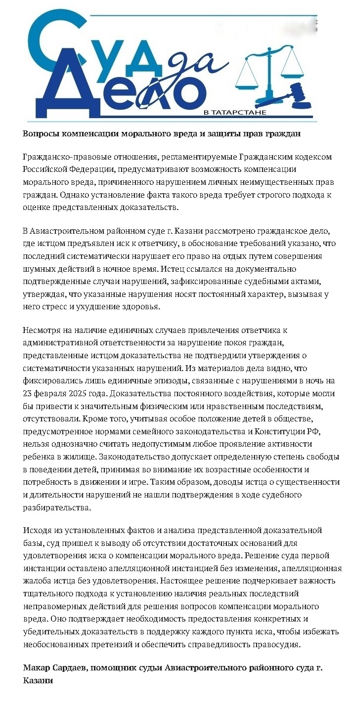 В выпуске газеты №2 (335) 2026 г. опубликована статья помощника судьи Авиастроительного районного суда г. Казани М. Сардаева "Вопросы компенсации морального вреда и защиты прав граждан"![]() |
